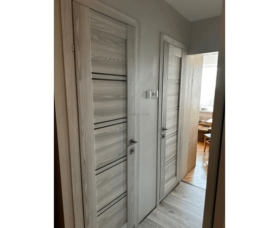 Koka karkasa durvis ar MDF detaļām, pārklātas ar ekofinierējumu, kas ir dabīgā koka tekstūras imitācija. Pārklājums ir noturīgs pret mitrumu un viegliem skrāpejumiem.