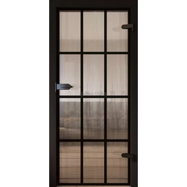 TRIESTE DRE pelēkas koka tekstūras iekšdurvis ar izliektām stikla līnijām, radot unikālu un modernu akcentu.