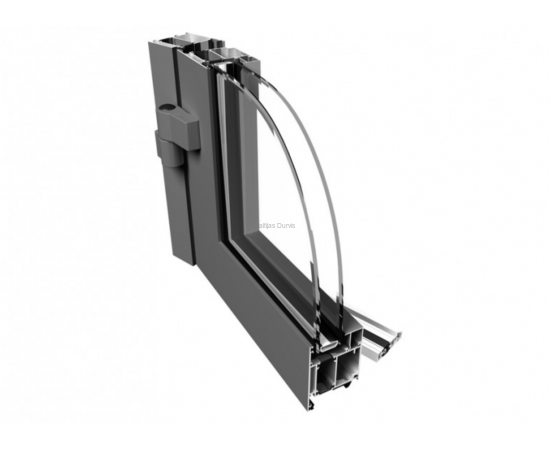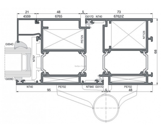 Ponzio PE68 дверная трехкамерная система. В данной системе профили находятся в одной плоскости (паз - 18 мм), также есть возможность использовать штапики (24 мм). Специально разработанные совместимые профили делают простотым соединение двери и окна. Конструктивная глубина рамы и створки составляет 68 мм. В данной системе может быть использовано большое количество аксессуаров и дверных замков.