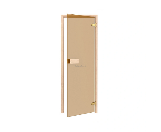 Дверь сауны. Магнитный фиксатор стекла. Закаленное коричневое стекло толщиной 8 мм. Каркас из клееной осины. Прямоугольная деревянная ручка с орнаментом.