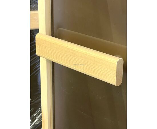 Дверь для сауны: матовое, толщиной 8 мм, закаленное стекло коричневого оттенка, полированные края. Петли металлические с пластиковой крышкой, устойчивы к коррозии, вбиты в раму по 2 штуки. Каркас из клееной древесины липы, сорт А, без сучьев. Ручка крепится двумя винтами. За дверной ручкой находится защелка с ловушкой. Симметричные двери, направление открывания можно легко изменить, повернув верхнюю раму вниз и повернув дверь.