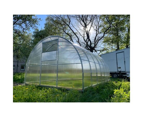 Теплица из поликарбоната с двухскатной крышей, изготовленная из оцинкованной металлической квадратной трубы (толщина 0.8 мм и размер 3 х 2 см), прочна и отлично подходит для климатических условий стран Балтии. Высота теплицы - 2.3 м, доступна длиной 4, 6 и 8 метров, в зависимости от пожеланий покупателя. Теплица оборудована двумя дверями (шириной 1 м) и 2 вентиляционными окнами, встроенными в двери на обоих концах теплицы. Установить можно как на почве, так и на фундаменте.